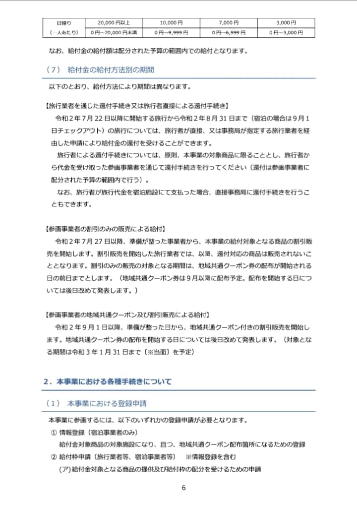 8月20日時点で「Go To トラベル」には、5984社の旅行業者と、1万6703社のホテルや旅館が登録。本登録の締切は8月21日だったが、この方針は今後も随時受け付ける事へと変更になった。戦果が出るまで投入するつもりである。