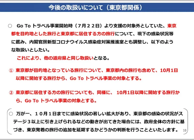 9月11日の共同通信によると、西村経済再生担当大臣は、10月1日より「Go To トラベル」に東京都を追加する方針を表明。新型コロナウイルス感染症対策分科会後の記者会見で「9月下旬にかけての感染状況を見極めて最終的に判断したい」と述べた。いい事だ。
