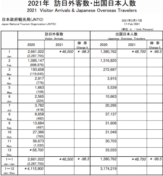 だが、その翌日の4日、日本は東京五輪における海外からの観戦者受け入れを断念する意向を示した。このことは、既に入金済みの約450億円のチケット収入や、1510億円の宿泊・飲食などの外貨獲得の遺失を意味する。また、5日には国交大臣が、緊急事態宣言を21日まで延長するという政府方針に従い、8日以降も「Go To トラベル」全国一律停止は継続すると述べた。