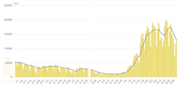 8月31日現在、47都道府県で確認された累積感染者数は1896万7755人に対し、死者数は3万9955人(昨年の2月17日から今年7月22日までのワクチン接種後死亡者1795人は含まず)。全数検査によって分母が急上昇したが、累積死亡率は0.21%へと着実に減っている。にもかかわらず、現在、訪日可能なのは、リスクが低いと判断された98の国や地域(度たびロックダウンを繰り返している中国も何故か含まれている)からのみである。これらの観光客は、ワクチン接種を受けていなくても入国時の検査や待機措置は免除され、それ以外の国と地域については、引き続き入国目的はビジネスや留学などに限定され、観光は受け入れの対象ではない。