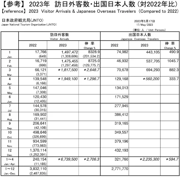 The trade balance is a deficit of 113.1 billion JPY. The travel balance is a surplus of 294.1 billion JPY, consisting of 376.9 billion JPY in credit and 82.8 billion JPY in debit. This month's Visitor Arrivals and Japanese Overseas Travelers are 1,949,100 persons for the former and 560,200 persons for the latter, so the unit price is 193,371 JPY for the inbound and 147,804 JPY for the outbound.