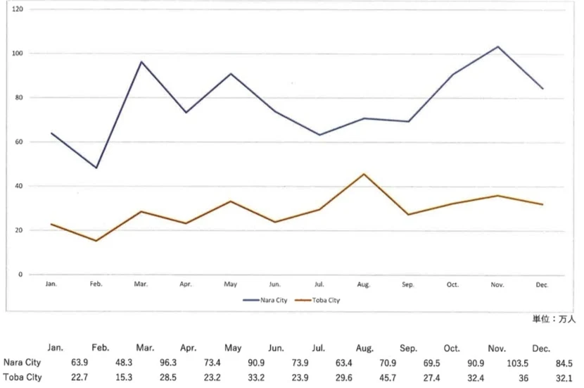 【2022年 奈良市と鳥羽市の延べ観光客数の比較】Comparison of the total number of tourists in Nara City and Toba City 2022