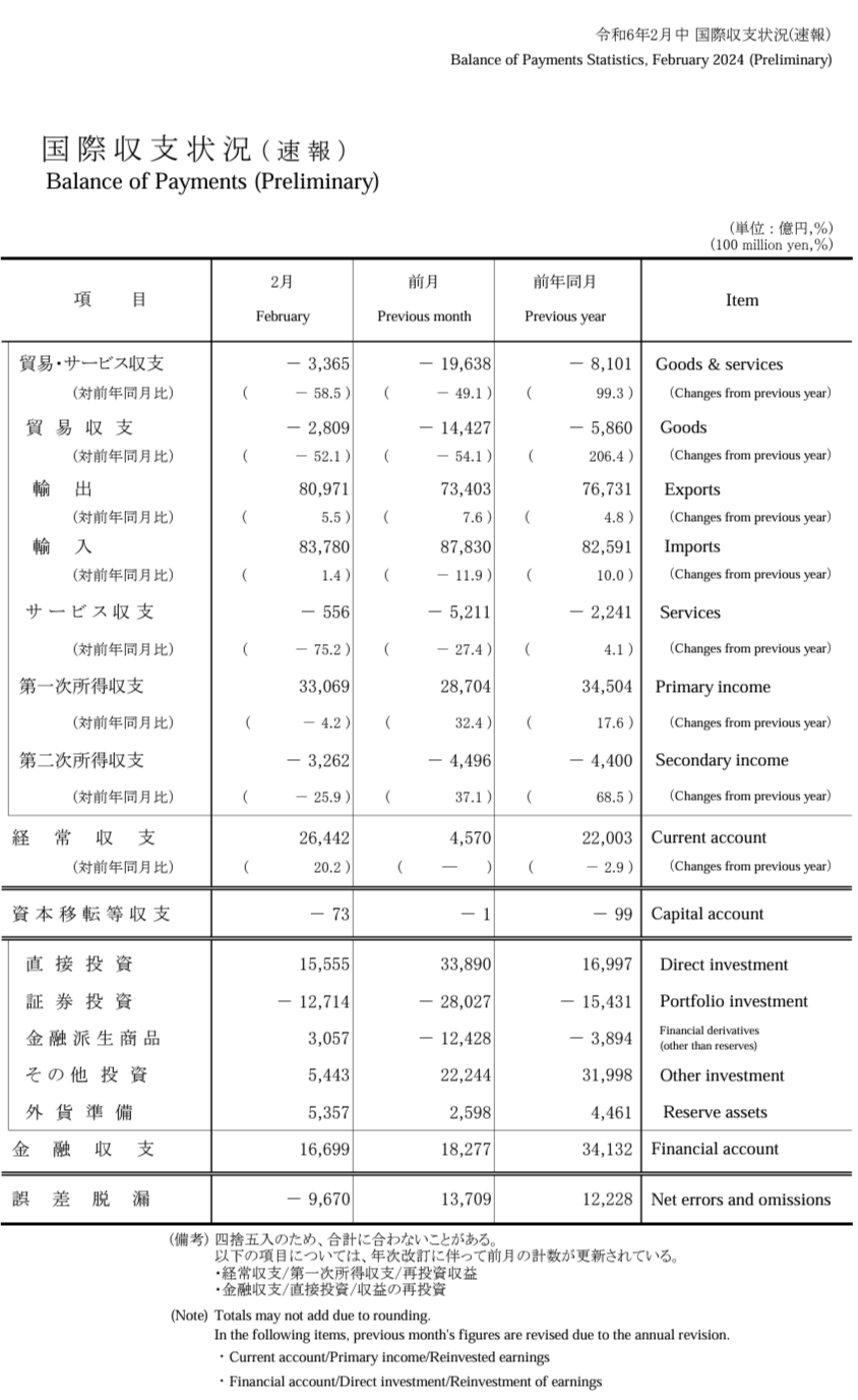 【2024年2月の国際収支】Balance of Payments for February 2024